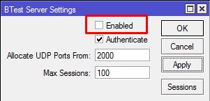كما يتميز برنامج Mikrotik Router بخادم Btest Server ، والذي يمكن استخدامه لاختبار الاتصالات التي تم تشكيلها. ولكن إذا استغلت هذه الميزة فجأة من قبل الغرباء ، فإن جهاز التوجيه لدينا يجبر على توليد حركة المرور أو الحصول على الـ bandwith لحركة المرور وقد يكون الـ bandwith الذي نفذناه مرتفع أو فجأة يصبح حمل وحدة المعالجة المركزية لدينا 100٪. وبطبيعة الحال ، لا يريد مشرفو الشبكات ذلك ، لهذا يتم إيقاف تشغيل هذه الميزة بشكل أفضل.