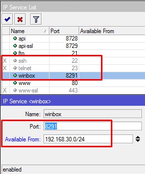 اي خدمة على برنامج Router Mikrotik افتراضيا مفتوحة بالفعل ، لذلك علينا أن نحدد بعض الخدمات التي نستخدمها عن بعد للـ router .