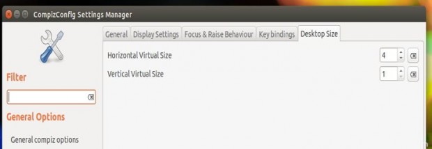 لتنشيط تأثير Desktop Cube ، ابحث عن ccsm على Dash ، افتح CompizConfig Settings Manager ، وانتقل إلى General Options -> Desktop Size وقم بتعيين القيمة Horizontal Virtual Size على 4 و Vertical Virtual Size إلى 1.