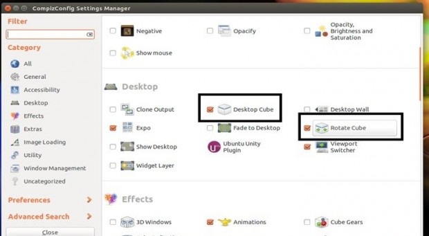 ثم ارجع وتحقق من Desktop Cube (Disable Desktop Wall) ومربعات Rotate Cube (Resolve Conflicts -> Disable Switch to Viewport 1) واضغط Ctrl + Alt + Left Mouse انقر لعرض تأثير المكعب.