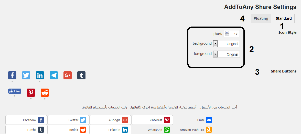 بعد تثبيت الإضافة نتوجة الان الى الاعدادات بلوحة تحكم الووردبريس ونختار AddToAny لتظهر لنا الخيارات التالية للإضافة :