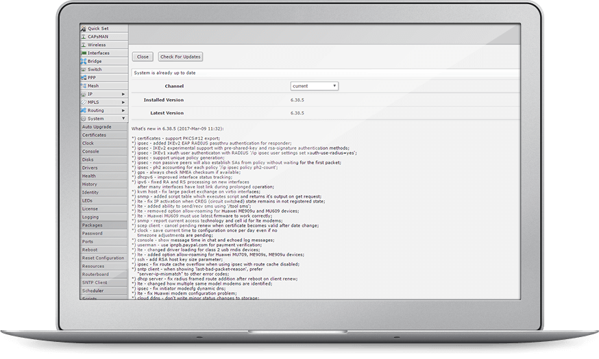 If you are already running RouterOS, upgrading to the latest version can be done by clicking on “Check For Updates” in QuickSet or System > Packages menu in WebFig or WinBox.