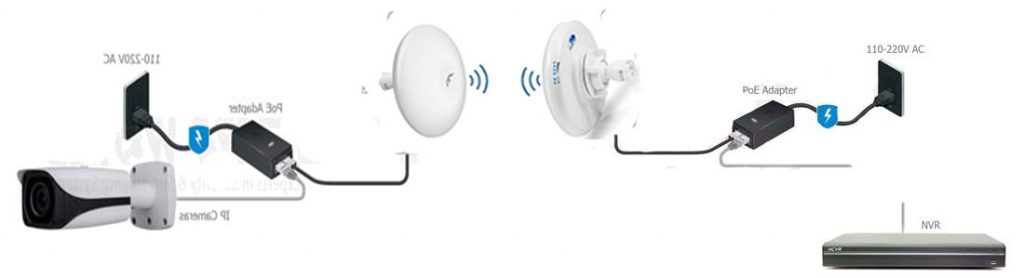 ثم نوصل كيبل اخر بطول لا يكون كبير من مدخل الانترنت في النانو بيم وطرفه الثاني في محول النانوبيم في مدخل POE طبعا نكون قد ثبتنا الكاميرا والنانوبيم في اماكنها بالقاعد او على الجدار حسب الموقع الذي تريد ثم نوجه النانو بيم بتجاه النانوبيم الذي اعددناه ليكون مستقبل وهو المتصل بجهاز ال NVR