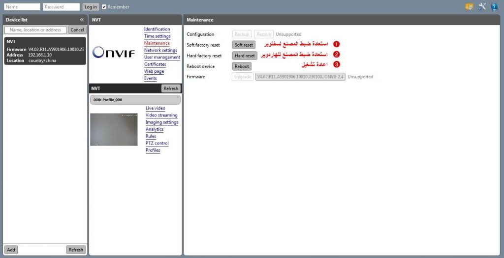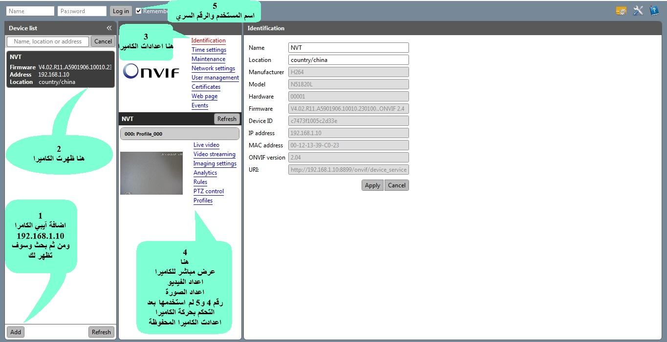 طبعا يجب أن تثبت ايبي الكمبيوتر لنضعه فرضا 192.168.1.5 أو أي ايبي لايتعارض مع الأجهزة لديك وفتحت برنامج ONVIF DEVICE MANAGER وسويت بحث طلعت الكاميرا من هذا البرنامج تستطيع تغيير كلمة السر وال IP الكاميرا والبورت وجميع الاعدادات