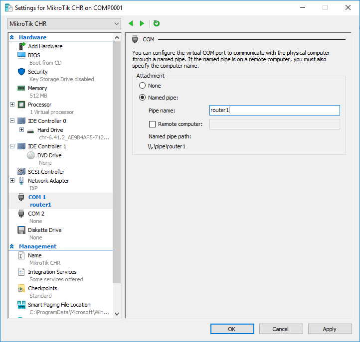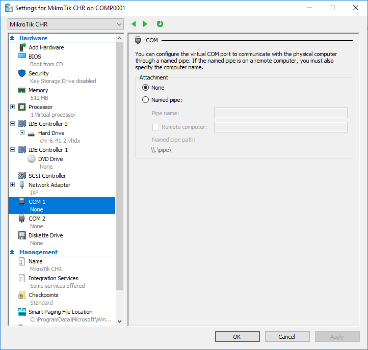 إن إضافة منفذ تسلسلي إلى CHR يعطينا “hardware” التي نحتاجها ، حتى ولو كانت افتراضية. في Hyper-V انقر بزر الماوس الأيمن على CHR VM. ثم حدد الإعدادات و COM1 إلى اليسار. لاحظ كيف لم يتم تضمين أي جهاز افتراضيًا في التهيئة: