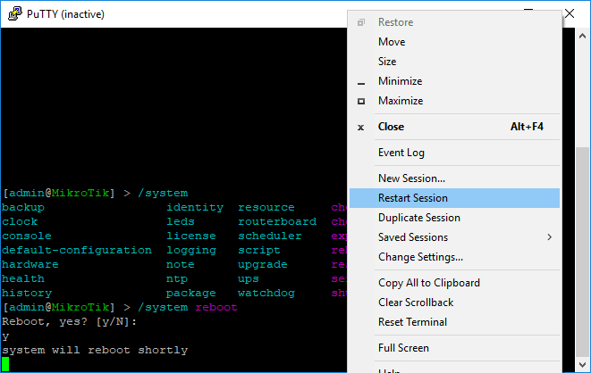 إذا تم إعادة تشغيل جهاز الراوتر، فيمكننا إعادة تشغيل جلسة العمل التسلسلية سريعًا بالنقر بزر الماوس الأيمن فوق شريط العنوان: