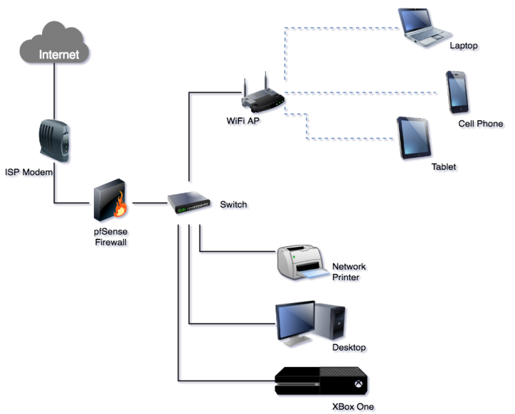 يظهر الإعداد “at home” الشائع لـ pfSense أدناه ، حتى أنني قمت بتضمين XBox One – الذي أظهر في البداية STRICT NAT … (مرسوم مع Draw.io)