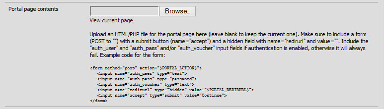 4- قم بالتمرير إلى أسفل حيث ستجد القسم التالي. يمكنك إنشاء صفحة بتنسيق HTML بنفسك ثم تحميلها إلى pfSense في صفحة إعدادات Captive Portal.