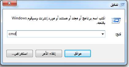 و لمن يرغب في تنفيذ هذا الأمر من نظام التشغيل ويندوز فما عليه إلا الضغط على علامة الويندوز مع الحرف (R) لتظهر شاشة التشغيل ثُم يكتب الأمر (CMD) -و هو إختصار لكلمة (Command Line)- و يضغط على موافق لفتح شاشة سطر الأوامر.