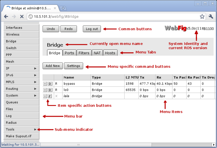 تم تصميم واجهة WebFig لتكون بديهية للغاية خاصة بالنسبة لمستخدمي WinBox. لديها تخطيط مشابه جدا: شريط القائمة على الجانب الأيسر ، التراجع / الإعادة في الأعلى والعمل في بقية المساحة المتاحة.