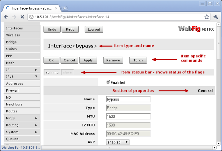 عند النقر على أحد العناصر المدرجة ، سيعمل webfig على فتح صفحة جديدة تعرض جميع المعلمات القابلة للتكوين ، والأوامر والحالات الخاصة بالعنصر.